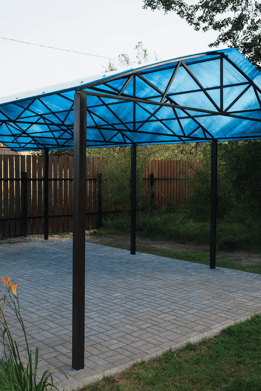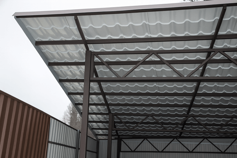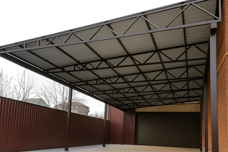 Чем больше площадь перекрытия, тем выше расход материалов и трудозатраты. Для маленьких навесов можно использовать облегчённые решения, тогда как для просторных потребуются усиленные опоры и фермы. -