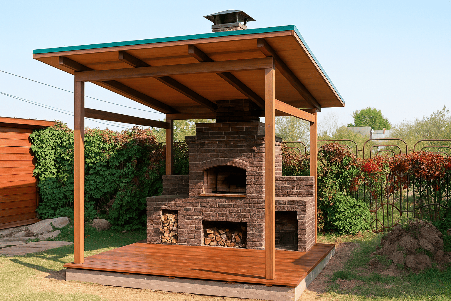 - Тип конструкции: навес над мангальной зоной может быть открытым, частично закрытым или полностью обустроенным.